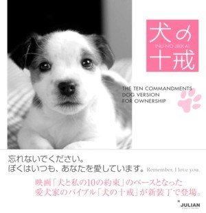 「犬の十戒」は7年前にうちのワンコが犬の幼稚園に行っていたころ、幼稚園のHPに掲載されていました。このメッセージを作った人は不明で、どうやらオリジナルは英語っぽいです。とても気に入ってHPのものをプリントアウトして、冷蔵庫にずっと張っておいたら、来春の映画の公開に伴い、最近とても脚光を浴びています。映画「犬と私の10の約束 (川口 晴)」の原作の日本語訳はとても簡略化されていて、子供にも理解しやすい訳になっていますが、こちらの本の訳は子供にはちょっと難しいかな。語彙やフリガナがない点など。でも大人向けには良いと思います。これは犬だけに当てはまる本ではなくて、すべてのコンパニオン・アニマルに当てはまりますね!ニャンコにも。これを読むたびに、"毎日"全国の保健所で処分されている1,200頭のワンコやニャンコのことを思うと、本当に胸が痛みます。